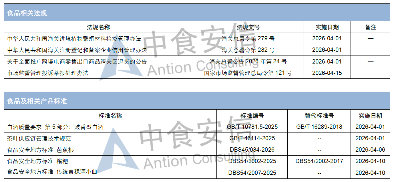 2026年4月1日起,《市场监督管理投诉举报处理办法》等多项与食品相关的法规标准将正式实施。为了更好地帮助企业了解重要法规情况,中食安信对相关内容进行了简单解读,供大家参考。