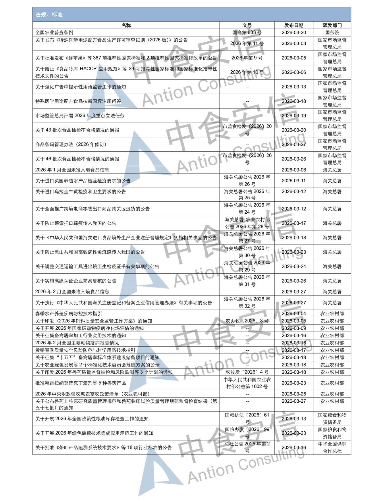 为了更好地帮助企业落地法规,中食安信对2026年3月份发布的重点法规、标准以及征求意见稿进行了简单解读,同时对本月发布的食品相关法规进行了汇总,供大家参考。