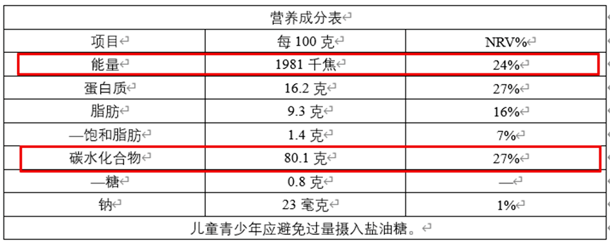 能量计算:能量(kJ)=蛋白质×17+脂肪×37+总碳水化合物×17。根据此计算规则,膳食纤维被计入“总碳水化合物”总量,但在计算产品总能量时,其贡献值使用的是与常规碳水化合物相同的系数(17 kJ/g)。