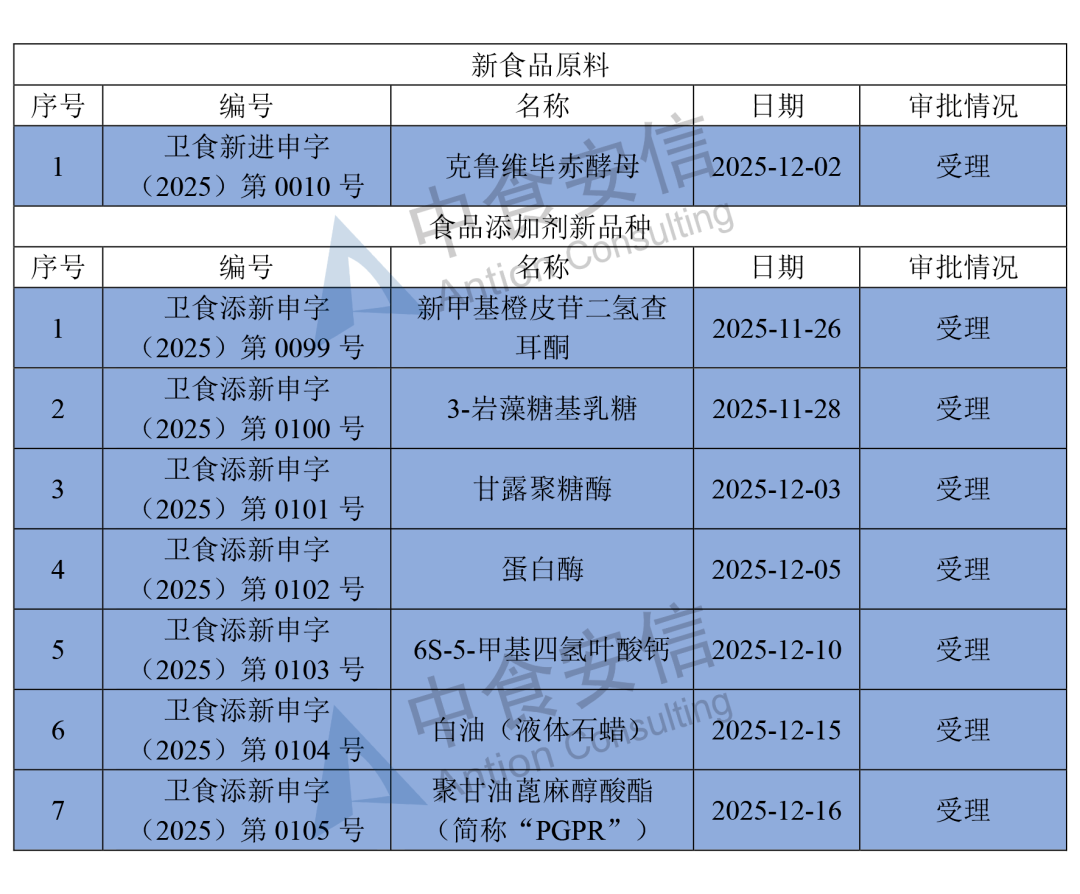 12月15日至12月21日,国家卫生健康委员会发布“三新食品”相关的受理审批情况8例,其中新食品原料受理1例;食品添加剂新品种受理7例。