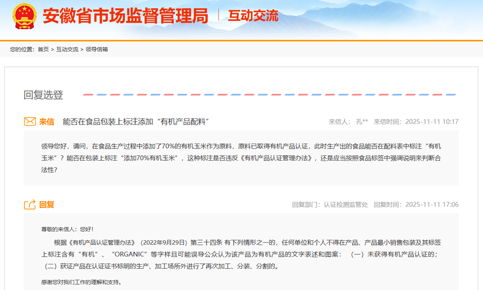2025年11月,一则关于食品包装标注“有机产品配料”的咨询与官方回复,引起了食品行业与消费者的关注。咨询者提出,若在食品生产中使用70%已获有机认证的玉米作为原料,成品是否可在配料表中标注“有机玉米”,或在包装上声明“添加70%有机玉米”?这涉及《有机产品认证管理办法》的准确适用与食品标签的合规性判断。