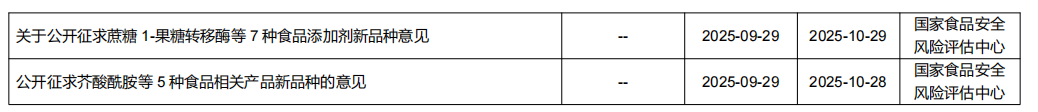 9月29日,风评中心对食品工业用酶制剂新品种蔗糖 1-果糖转移酶、葡糖异构酶,食品用香料新品种2-甲基-1-(2-(5-对甲苯基)-1H-咪唑-2-基)哌啶-1-基)丁-1-酮,食品营养强化剂乳糖-N-四糖新生产菌,扩大使用范围的食品添加剂二氧化碳,增补质量规格要求的食品营养强化剂2’-岩藻糖基乳糖、乳糖-N-新四糖征求意见,截止日期为2025年10月29日。