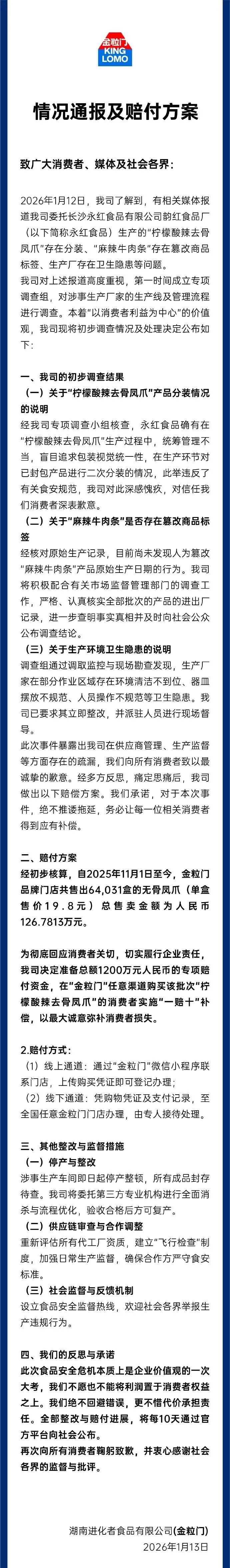 为彻底回应消费者关切,切实履行企业责任,我司决定准备总额1200万元人民币的专项赔付资金,在“金粒门”任意渠道购买该批次“柠檬酸辣去骨凤爪”的消费者实施“一赔十”补偿,以最大诚意弥补消费者损失。