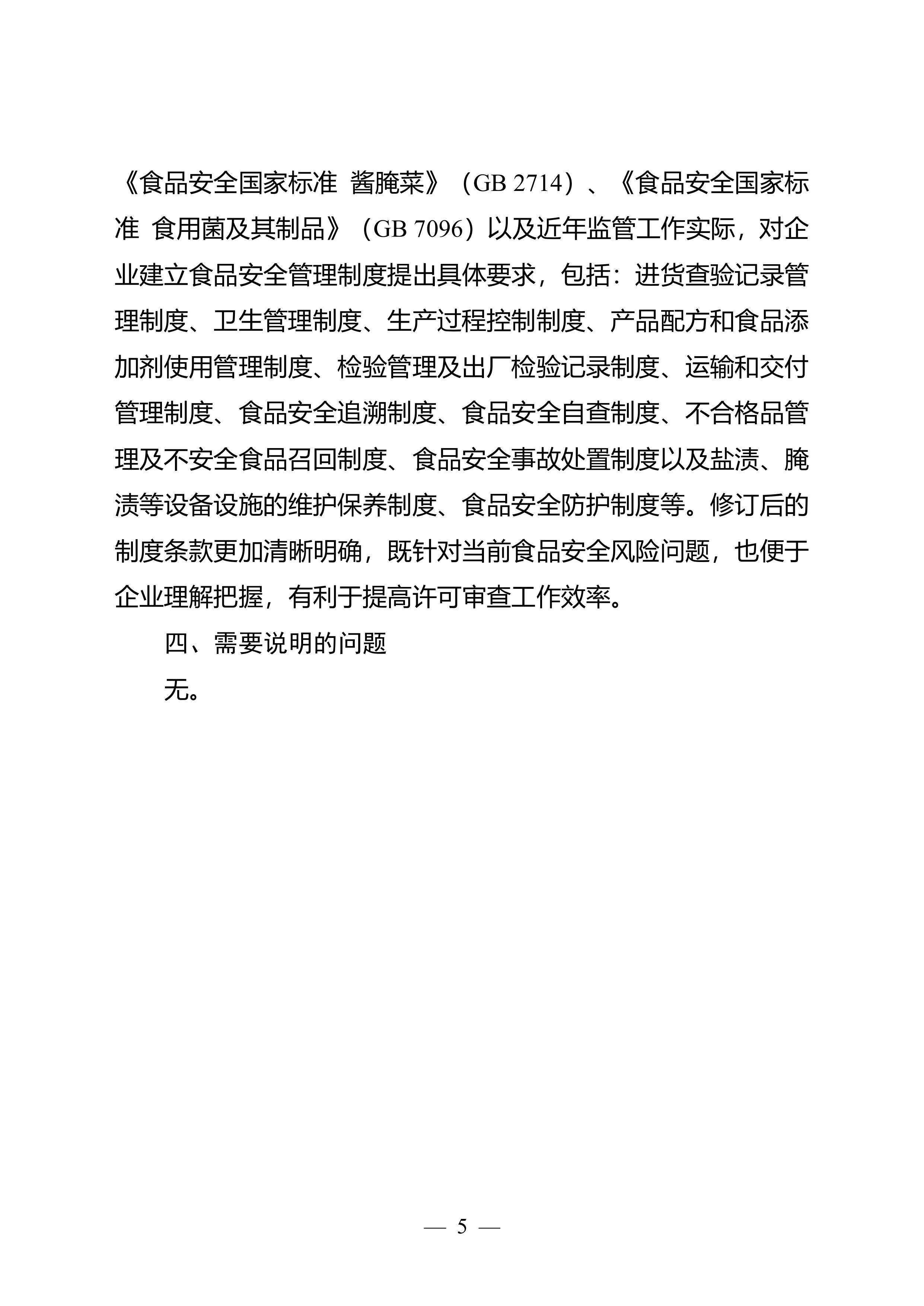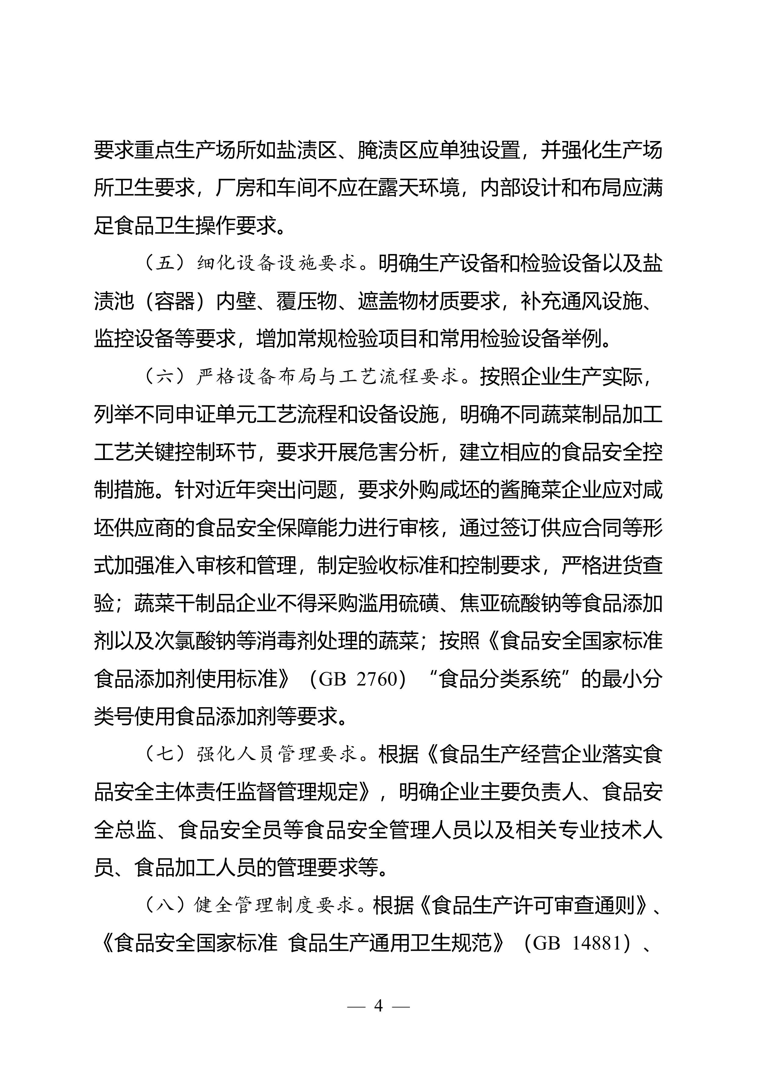 《蔬菜制品生产许可审查细则(征求意见稿)》主要修订了4个方面内容。一是完善许可范围。结合蔬菜制品新产品、新工艺、新业态发展趋势,新增蔬菜泥(酱)等品种明细,更加贴合蔬菜制品生产需求和行业发展实际,有助于促进蔬菜制品产业高质量发展。二是强化卫生管理。要求在传承酱腌菜传统特色工艺的基础上,细化生产作业区划分,制定卫生监控制度,确保卫生环境处于良好状态。三是严格风险管控。要求强化原料进货查验,不得采购滥用硫磺、焦亚硫酸钠等食品添加剂的蔬菜;要求开展生产全过程危害分析,建立相应的食品安全控制措施。四是健全食品安全管理制度。要求建立产品配方和食品添加剂使用管理、运输和交付管理、食品安全防护等管理制度,既利于企业防控风险,也便于提高许可审查效率。此外,还细化了生产场所、设备设施、人员管理等要求。