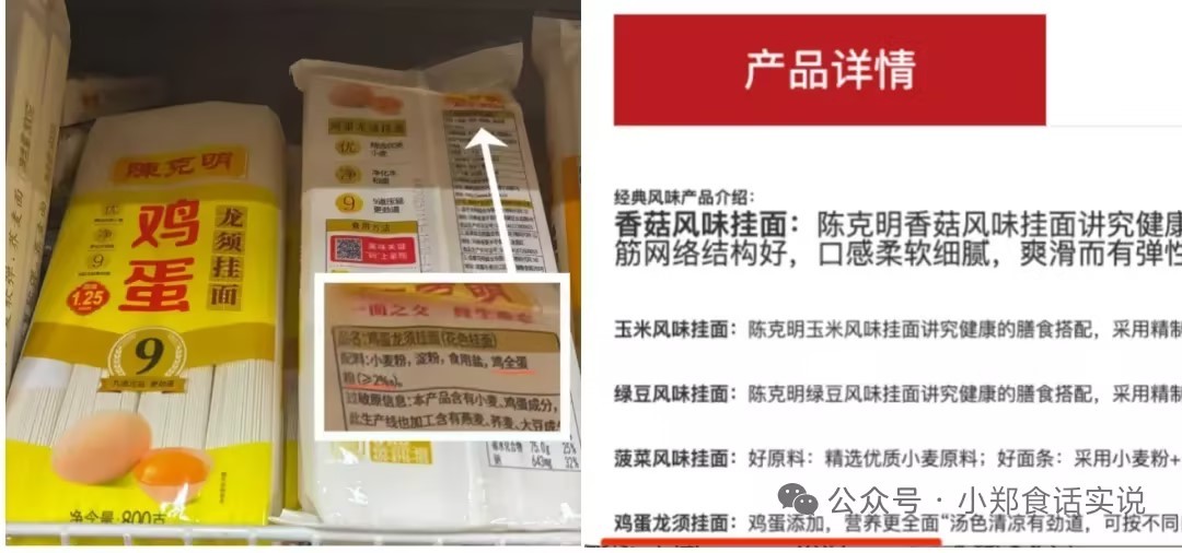 陈克明鸡蛋龙须挂面配料写着“鸡全蛋粉≧2‰” (左图,上游新闻记者 冯盛雍 摄)官网展示产品详情:鸡蛋添加,营养更全面。(右图 陈克明公司官网截图)
