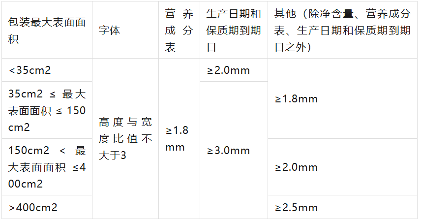 字符高度按照包装最大表面面积进行区分,要求如下: