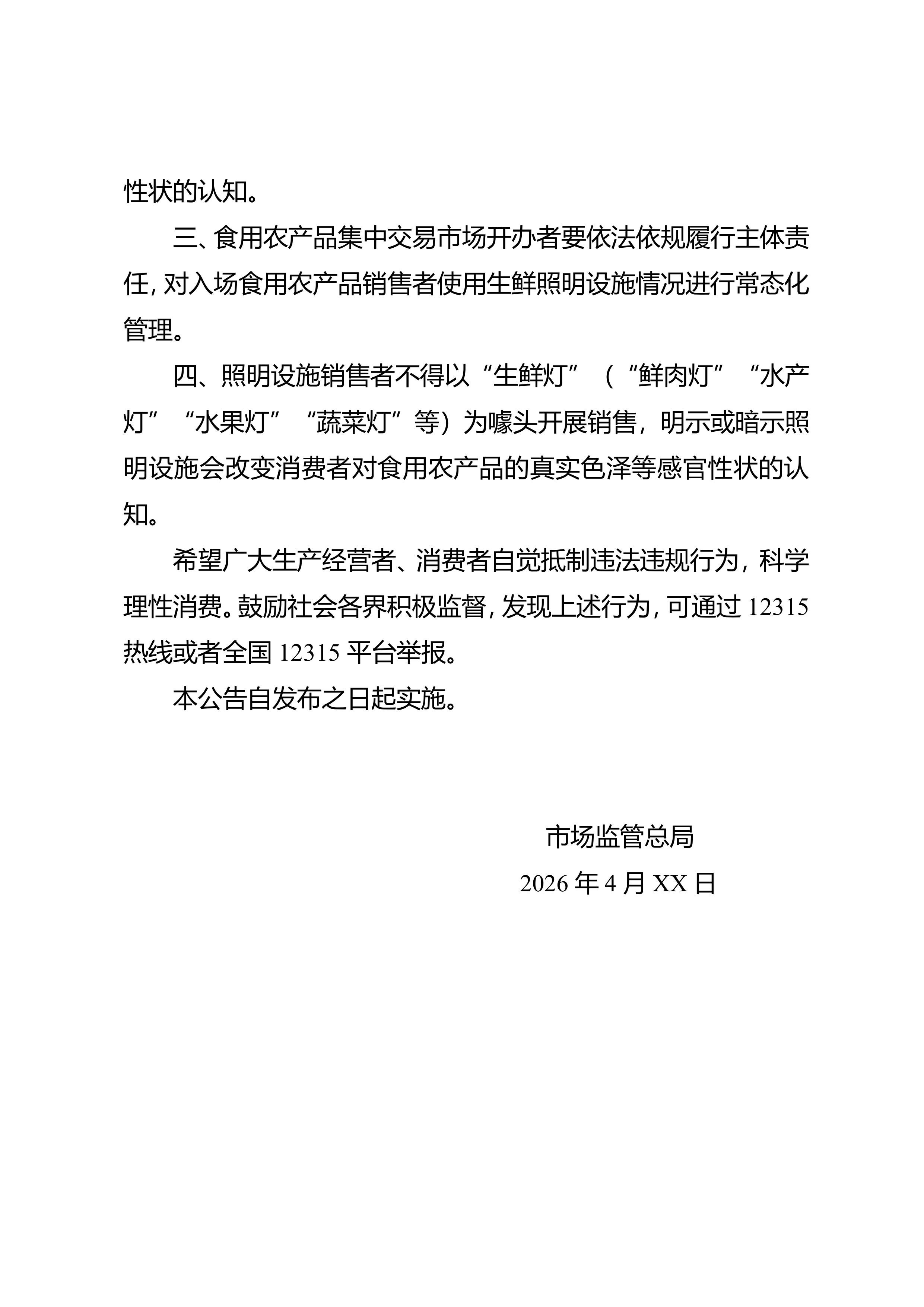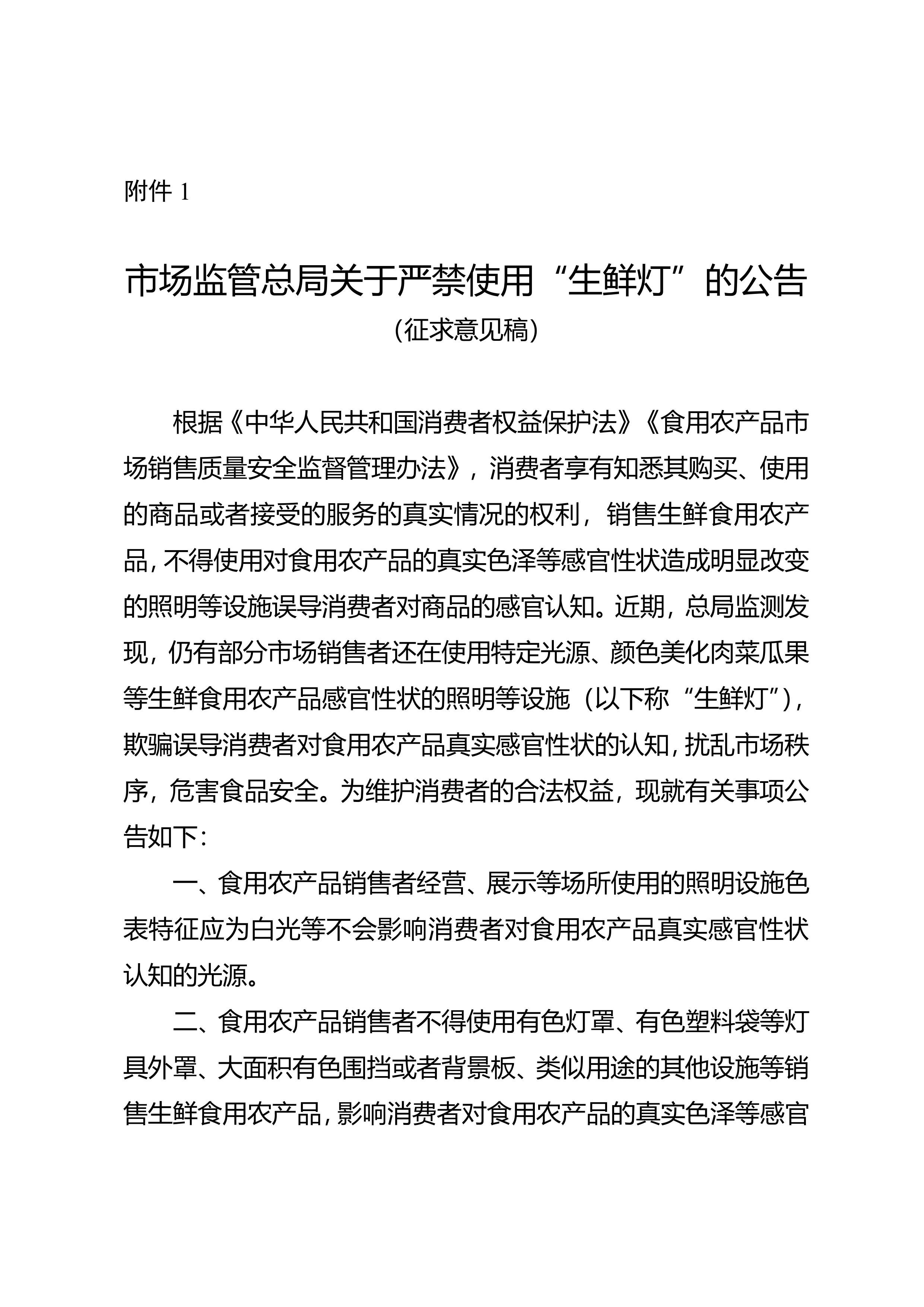1.市场监管总局关于严禁使用“生鲜灯”的公告(征求意见稿)