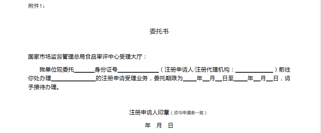 注册申请人现场提交行政许可项目申报材料、领取许可决定文书或配合开展特殊食品注册现场核查工作时,须同时提交注册申请人(与申请表盖章单位一致)向具体办理人员出具的授权委托书,以及具体办理人员的身份证明原件及复印件(原件核对后退回)。委托书应明确办理人员身份,如办理人员为注册申请人在职员工,需提交相应的在职证明;如办理人员为注册代理机构人员,需明确注册代理机构名称。委托书参考式样详见附件1、附件2、附件3。