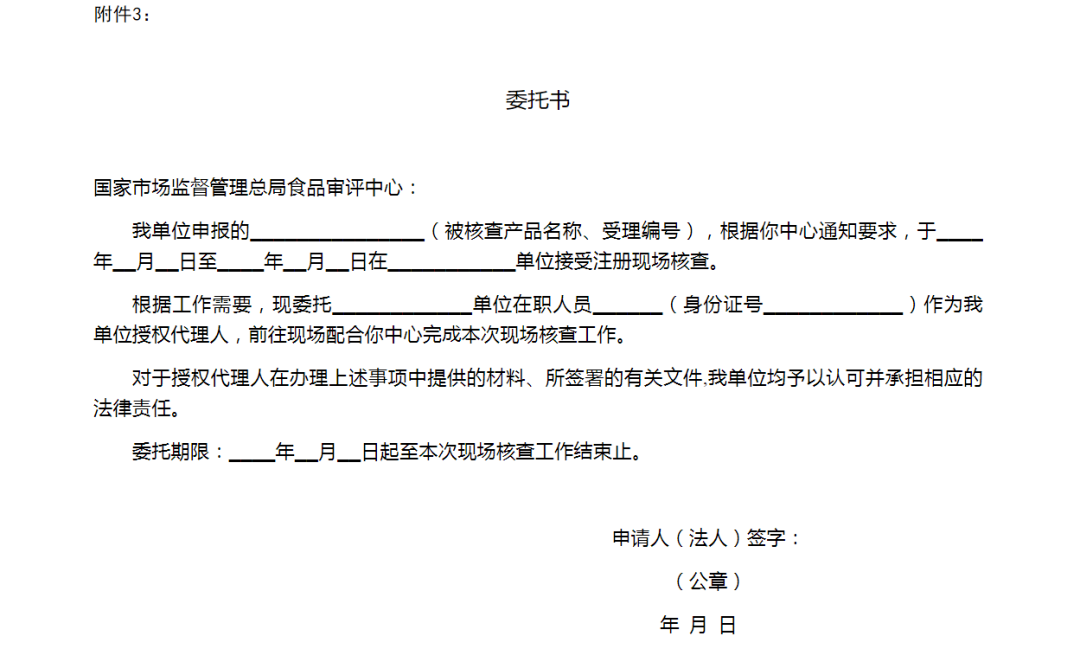 附件3.委托书—办理特殊食品注册现场核查业务用
