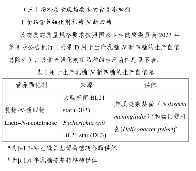 根据《食品添加剂新品种管理办法》和《食品添加剂新品种申报与受理规定》,食品营养强化剂新品种3’-唾液酸乳糖钠盐、食品工业用加工助剂新品种硝酸、增补质量规格要求的食品营养强化剂乳糖-N-新四糖和维生素E(dl-α-醋酸生育酚)的申请,其安全性和工艺必要性已通过专家评审委员会技术审查(具体情况见附件),现公开征求意见。请于2026年1月2日前将相关意见反馈至我中心邮箱(zqyj@cfsa.net.cn),逾期将视为无意见。