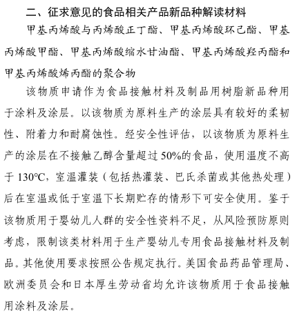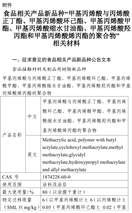 根据《食品相关产品新品种行政许可管理规定》和《食品相关产品新品种申报与受理规定》要求,食品相关产品新品种“甲基丙烯酸与丙烯酸正丁酯、甲基丙烯酸环己酯、甲基丙烯酸甲酯、甲基丙烯酸缩水甘油酯、甲基丙烯酸羟丙酯和甲基丙烯酸烯丙酯的聚合物”已通过专家评审委员会技术评审(具体情况见附件)。现公开征求意见,请于2026年5月23日前将书面意见反馈至邮箱,如在截止日期前未反馈相关意见,视为无不同意见。