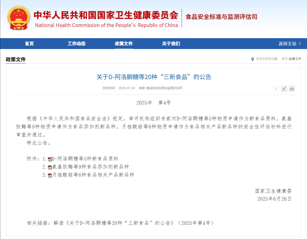 2025年7月2日,国家卫生健康委员会发布了2025年第4号《关于D-阿洛酮糖等20种“三新食品”的公告》,微元合成成为全国首家获得批准上市的D-阿洛酮糖生产企业。