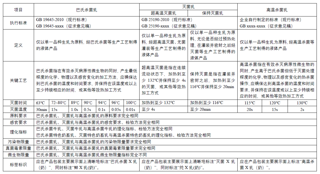 中食安信根据本次国家卫生健康委员会发布的《食品安全国家标准 巴氏杀菌乳》(征求意见稿)、《食品安全国家标准 灭菌乳》(征求意见稿)和《食品安全国家标准 高温杀菌乳》(征求意见稿),总结巴氏杀菌乳、灭菌乳、高温杀菌乳的定义、关键工艺、灭菌时间及温度、理化指标等方面的异同点,具体内容见下表:
