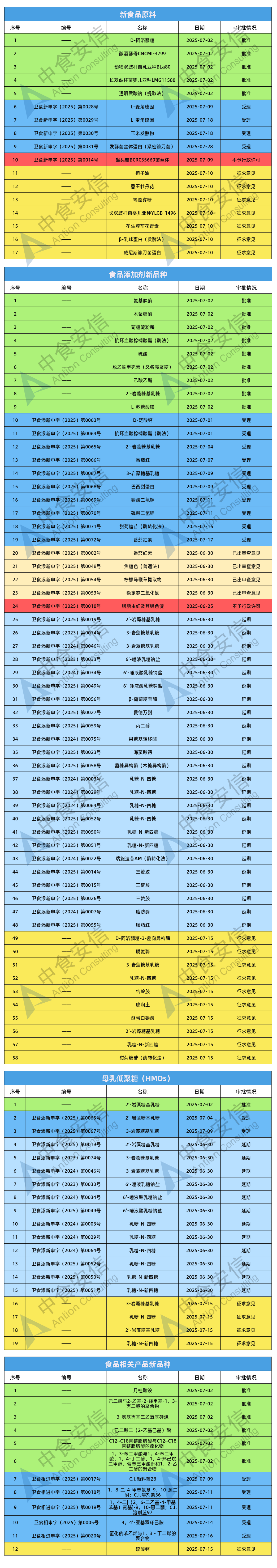 2025年7月,卫健委共发布87例三新食品相关的受理审批情况。新食品原料17例,其中批准5例、受理4例、不予行政许可1例、征求意见7例;食品添加剂新品种58例,其中批准9例、受理10例、已出审查意见4例、不予行政许可1例、延期24例、征求意见10例;其中母乳低聚糖(HMOs)19例,批准1例、受理2例、延期12例、征求意见4例;食品相关产品新品种12例,其中批准6例、受理5例、征求意见1例。
