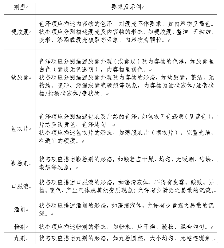 感官要求一般应包括产品的外观(色泽、状态等)和内容物的色泽、滋味、气味、状态等项目。其中色泽项应有明确描述,允许对色泽描述规定一定的范围,尽量不要跨色系。一般情况下,由浅至深描述的顺序,如棕黄色至棕褐色。复合颜色的描述则以辅色在前、主色在后,如黄棕色,即以棕色为主、黄色为辅。滋味、气味项应有明确描述。对于状态项,如产品属于药典收载剂型,可参照《中华人民共和国药典》(2025年版)描述其状态,如属于食品形态,可参照相应国家相关标准描述其状态,并应包含对杂质的描述(如无正常视力可见外来异物)。要求及示例如下: