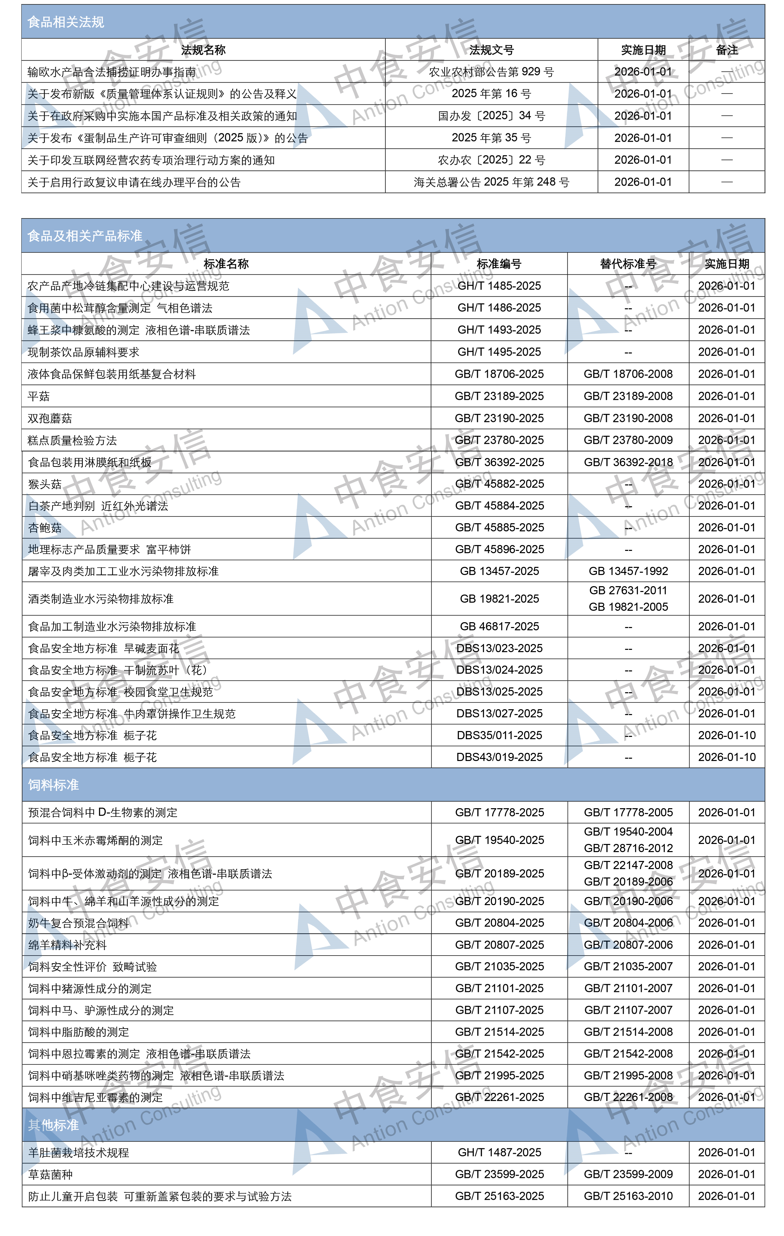 除该《细则》外,中食安信还梳理汇总了2026年1月正式实施的国家标准、地方标准等法规标准。详细内容请见附件。