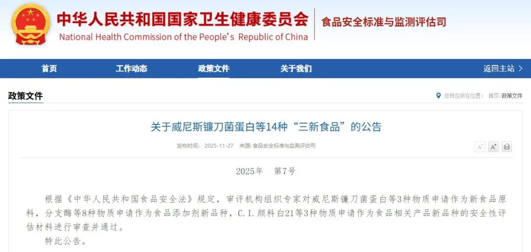 2025年11月27日,国家卫生健康委员会发布了2025年第7号《关于威尼斯镰刀菌蛋白等14种“三新食品”的公告》,盈嘉合生成为全国首家获批上市的甜菊糖苷(发酵法)生产企业。 中食安信作为甜菊糖苷(发酵法)的全程申报代理机构,通过与盈嘉合生的密切配合,完成了项目评估、材料撰写、试验检测等全链条申报服务工作。 * 国家卫健委发布2025年第7号“三新食品”公告,批准分支酶、β-丙氨酸、(6S)-5-甲基四氢叶酸,氨基葡萄糖盐、6S-5-甲基四氢叶酸钙、甜菊糖苷(酶转化法)、甜菊糖苷(发酵法)、2’-岩藻糖基乳糖、碳酸钙(海藻来源)等8种食品添加剂新品种。 PART.1 甜菊糖苷(发酵法) 甜菊糖苷作为甜味剂已列入《食品安全国家标准食品添加剂使用标准》(GB 2760)。本次公告的甜菊糖苷(发酵法)是利用新生产工艺制得的食品添加剂新品种,其使用范围和使用量执行GB2760及相关公告中已批准甜菊糖苷的规定。该物质作为甜味剂,改善产品口感、替代蔗糖。 经安全性评估,甜菊糖苷(发酵法)在已批准食品类别中可以安全使用,其质量规格按照公告的相关要求执行。根据联合国粮农组织/世界卫生组织食品添加剂联合专家委员会评估结果,该物质的每日允许摄入量为0-4mg/kg bw(以甜菊醇当量计),国际食品法典委员会、美国食品药品管理局等允许甜菊糖苷(发酵法)作为甜味剂用于多种食品类别。 PART.2 生物制造与绿色制造 中食安信拥有专业的技术能力和丰富的申报经验,可以为客户提供“三新食品”从项目评估、材料编写、试验检测到申报递交、补正沟通等全流程的代理申报服务,帮助企业选择合适的申报方向,提高申报效率,减少人力、资金成本,降低申报风险。如果您有“三新食品”相关问题,欢迎您通过以下方式与我们联系。相关阅读