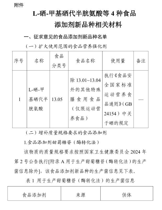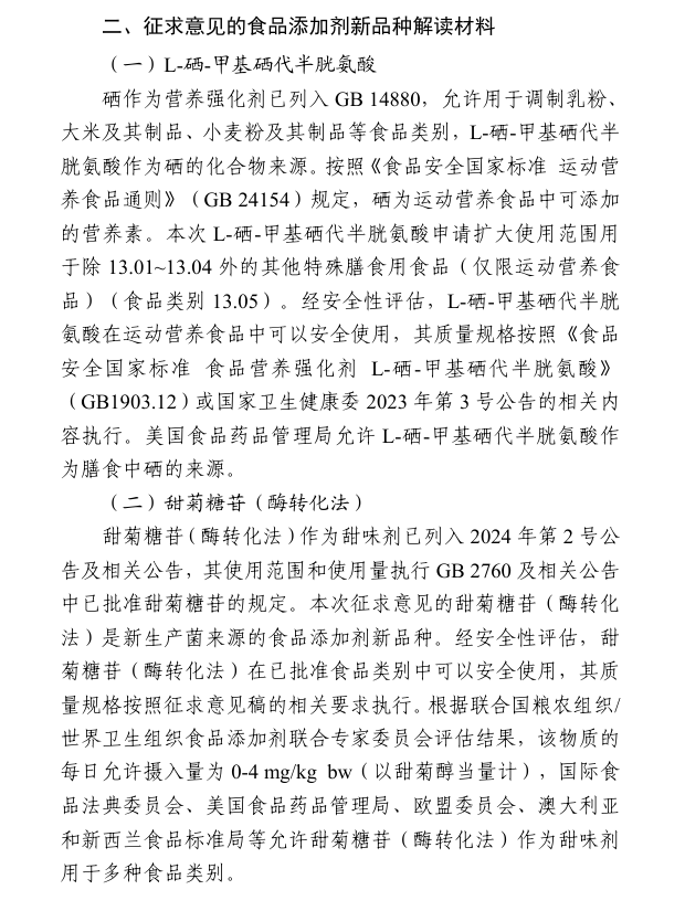 根据《食品添加剂新品种管理办法》和《食品添加剂新品种申报与受理规定》,扩大使用范围的食品营养强化剂L-硒-甲基硒代半胱氨酸、甜菊糖苷(酶转化法)等3种增补质量规格要求的食品添加剂的申请,其安全性和工艺必要性已通过专家评审委员会技术审查(具体情况见附件),现公开征求意见。请于2026年1月28日前将相关意见反馈至我中心邮箱(zqyj@cfsa.net.cn),逾期将视为无意见。