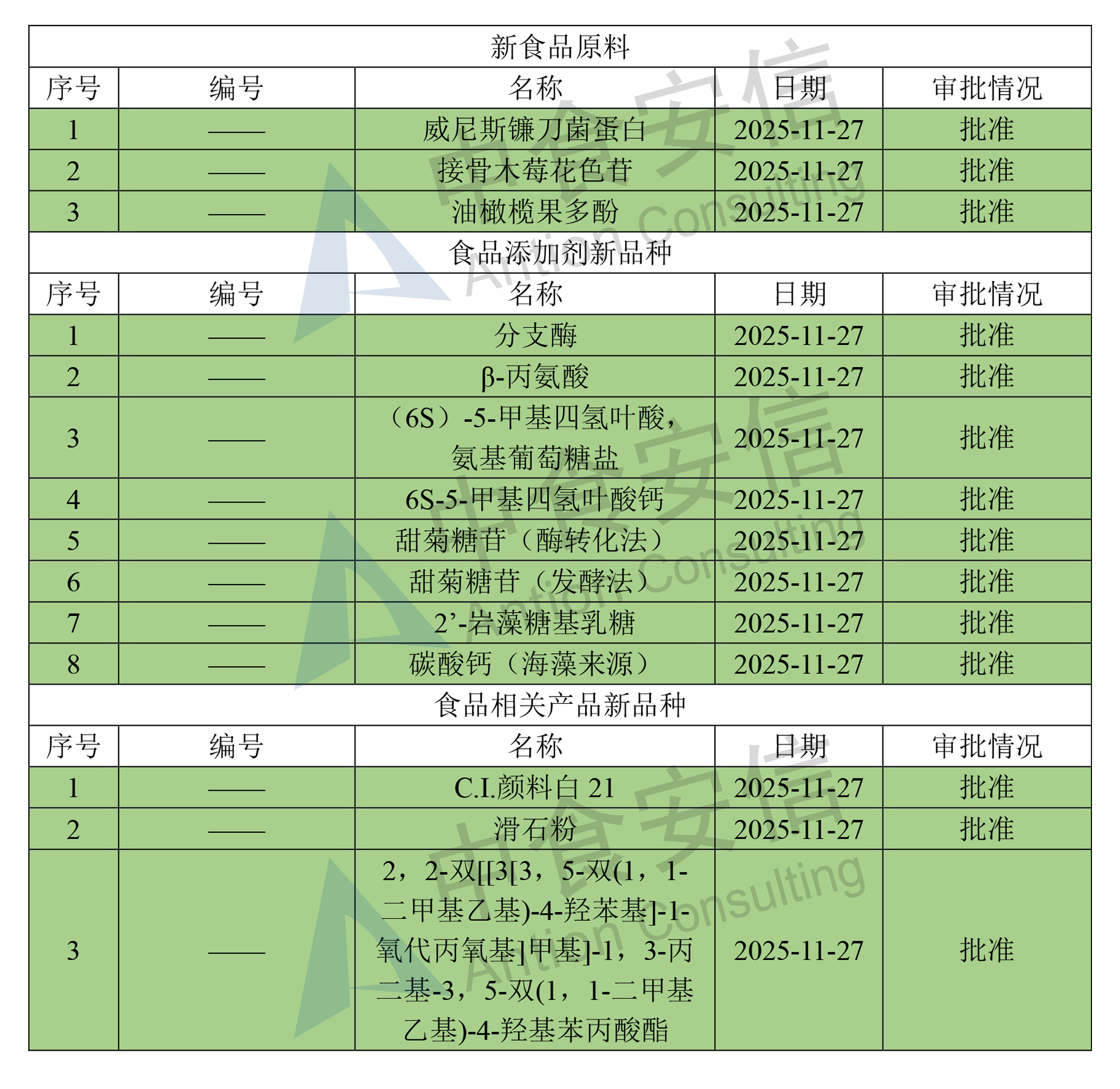 中食安信根据国家卫生健康委员会发布的信息整理了11月24日至11月30日“三新食品”的申报审批情况。具体情况如下: