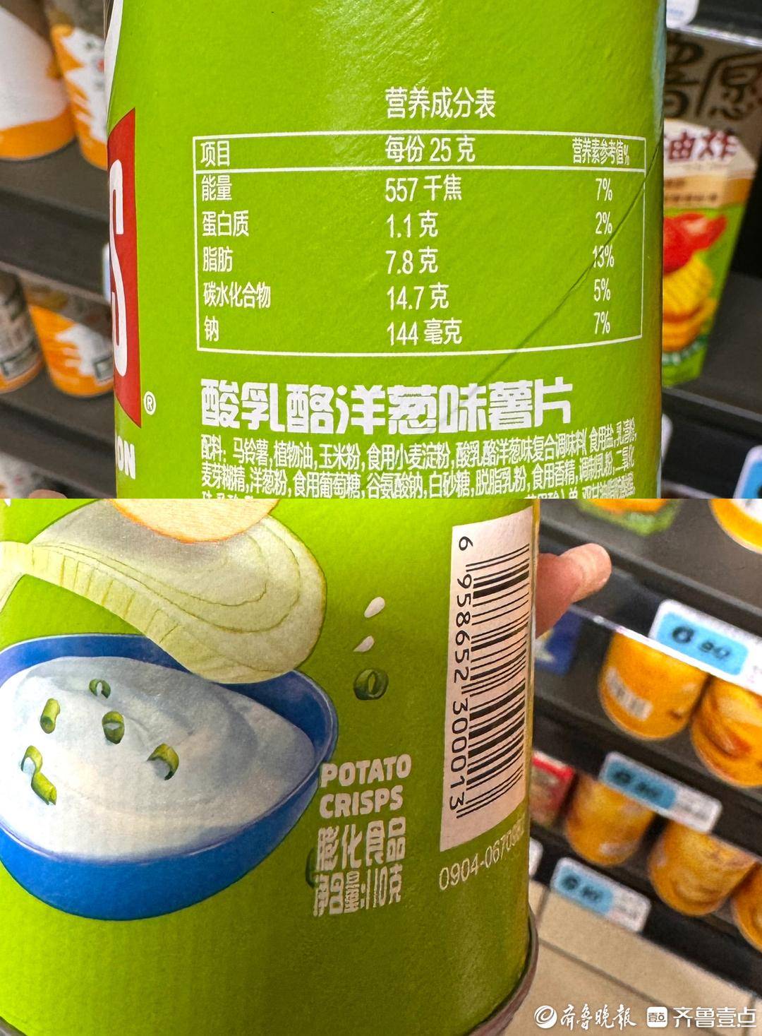 更值得注意的是,品客一款净含量110克的酸乳酪洋葱味罐装薯片,更是标注“每份 25 克、能量 557 千焦”,看似一眼低热量的薯片折算后整罐热量达到2450.8千焦,相当2碗熟米饭的热量。