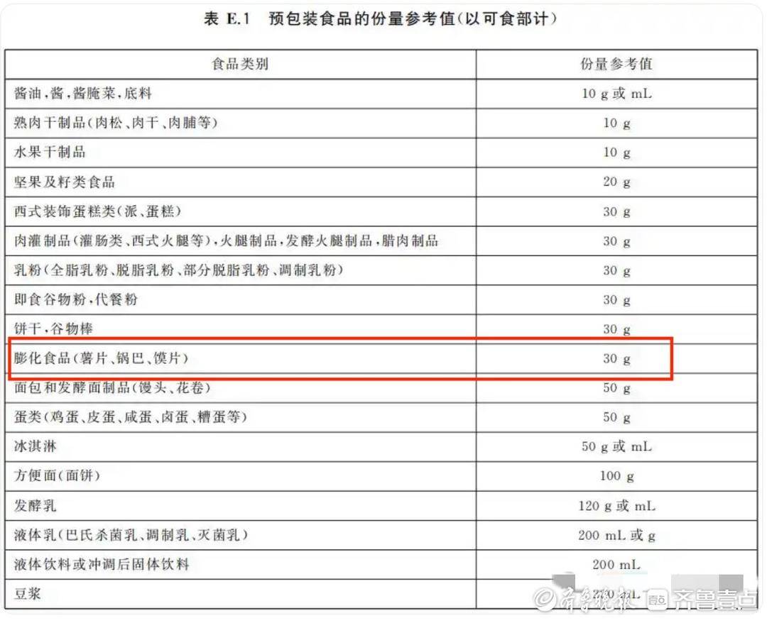 从《预包装食品的份量参考值(以可食部计)》表格中可以看到,膨化食品 (薯片、锅巴、馍片)的分量参考值为30克。