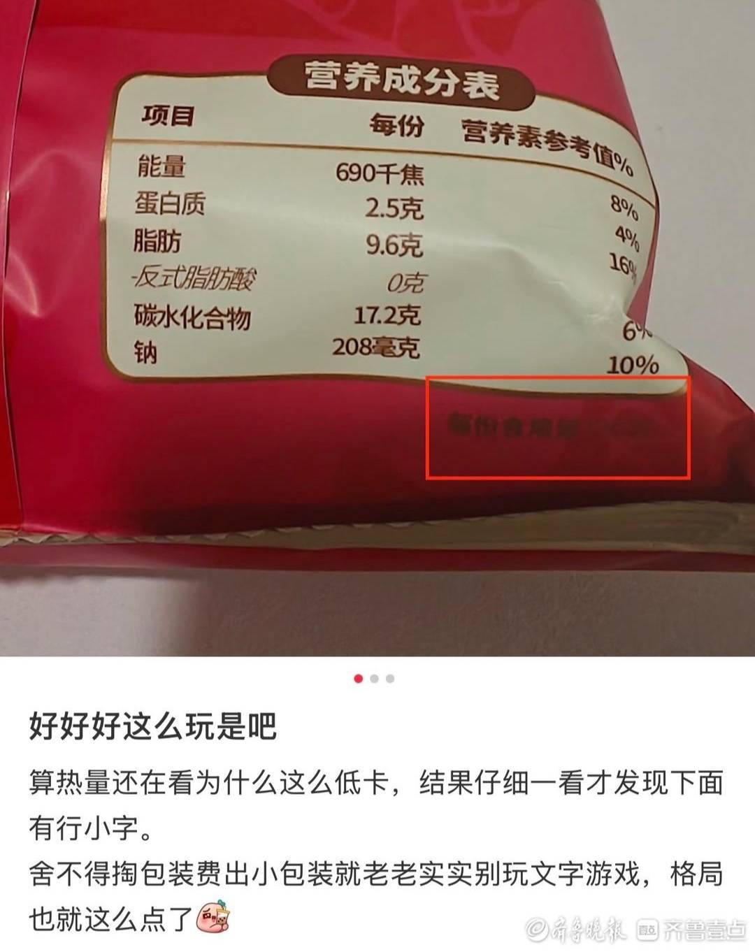 面对复杂的热量计算题,有网友表示:“为什么还要计算?直接标注一整包的热量不就好了?”“数学不好的人看得一头雾水”,也有人质疑“营养成分表不应该都以100克为单位来标注吗?”