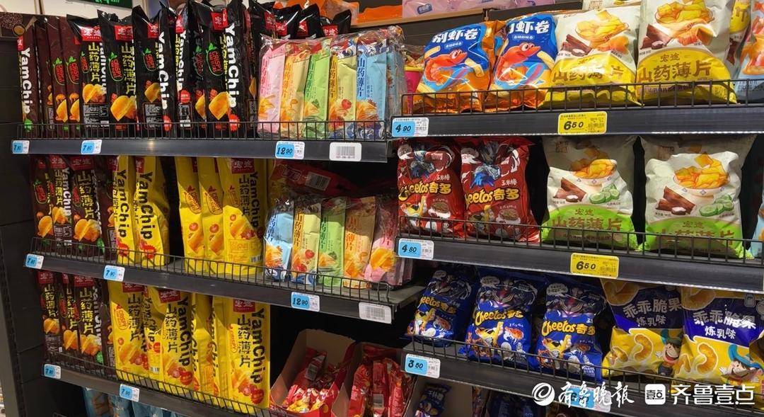 在济南一家大型超市里,记者注意到,多数食品的营养成分表中,“每100克”为最常见的标注方式,但膨化食品货架上,多款膨化食品品牌却采用了“小份标注”模式。例如占据货架大片面积的乐事、上好佳等主流品牌,旗下袋装、罐装的薯片、虾条、山药薄片等产品,营养表多以“每份 30 克”标注,这些产品净含量介于60-175克之间,每份热量普遍标注为500-750千焦,算下来整包、整罐零食的热量要翻几番。