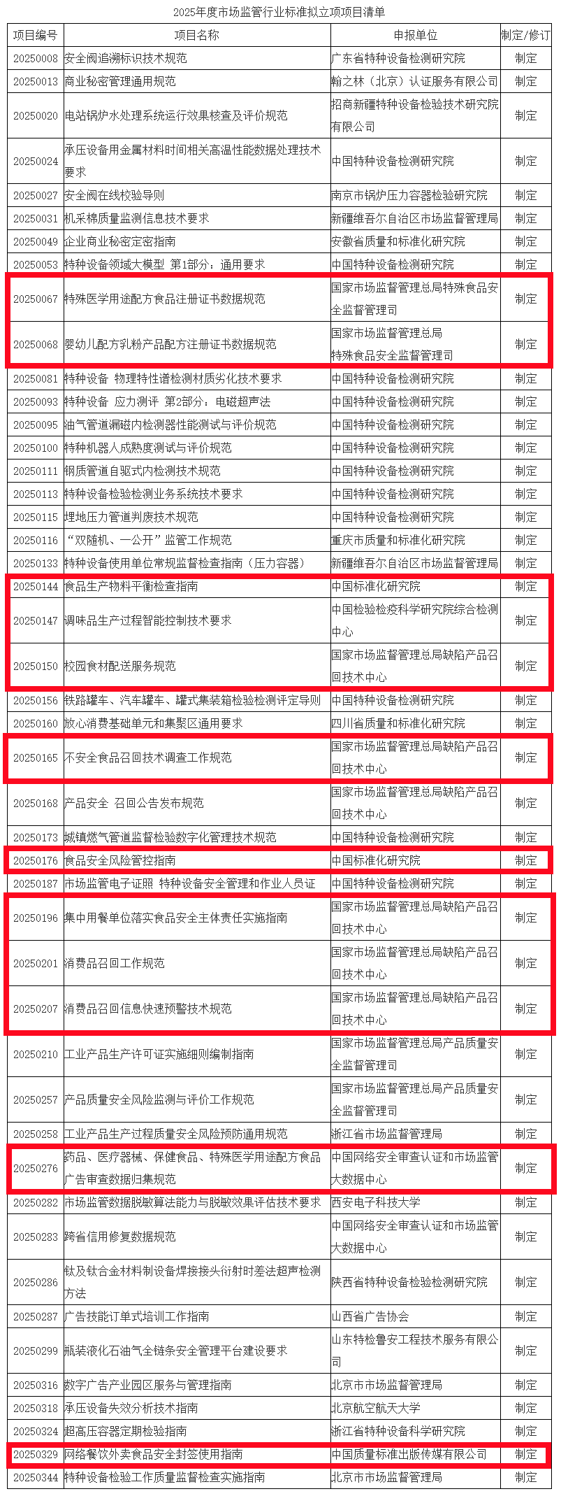 为深入贯彻落实《国家标准化发展纲要》,充分发挥标准化对市场监管业务的支撑保障作用,根据《市场监管行业标准管理办法》、《市场监管行业标准制定管理实施细则》(国市监办发〔2023〕36号)等有关规定,中国网络安全审查认证和市场监管大数据中心组织开展了2025年度市场监管行业标准制修订项目申报工作。经各单位申报、业务主管司局初审、专委会专家评审,拟对《安全阀追溯标识技术规范》等46项标准予以立项,现将标准项目名称、申报单位予以公示(名单见附件)。