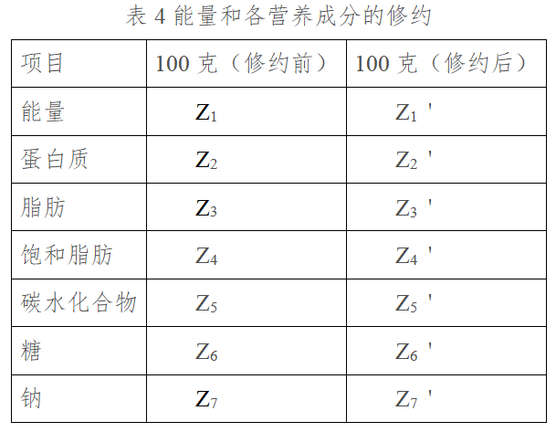 第三步:通过上述原辅材料的营养成分数据,计算产品A的每种营养成分数据和能量值,并结合能量及各营养成分的允许误差范围,对能量和营养成分数值进行修约。