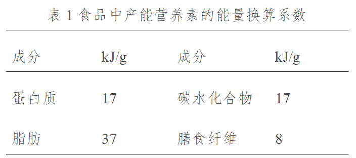 营养标签上标示的能量由计算法获得。即蛋白质、脂肪、碳水化合物等供能成分的含量标示值乘以各自相应的能量换算系数并进行加和,能量值以千焦(kJ)为单位标示。当产品营养成分表中标示膳食纤维时,应以8kJ/g为换算系数计算膳食纤维提供的能量。