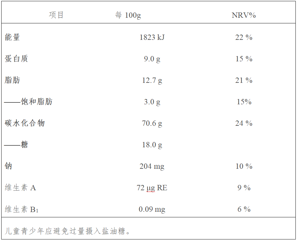营养成分表是标有食品能量和营养成分名称、含量及其占营养素参考值(NRV)百分比的规范性表格。