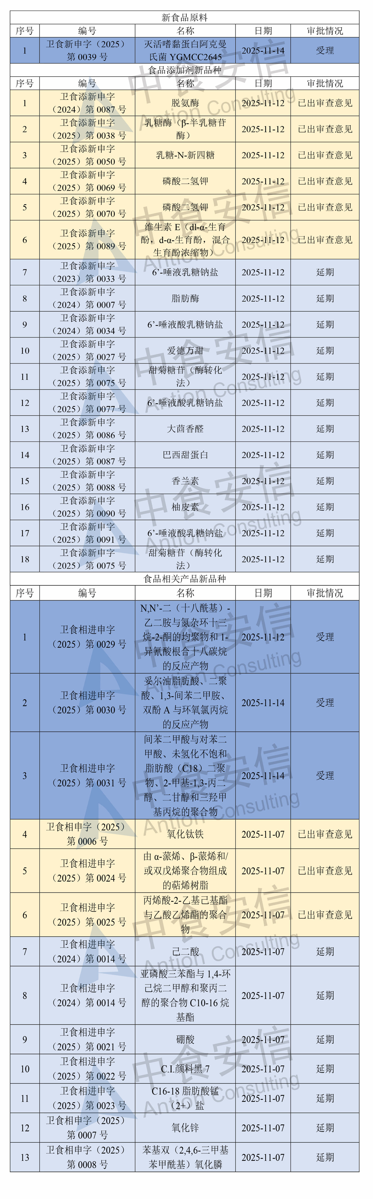 中食安信根据国家卫生健康委员会发布的信息整理了11月10日至11月16日“三新食品”的申报审批情况。具体情况如下: