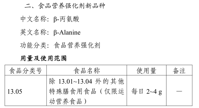 本次发布公告的β-丙氨酸作为食品营养强化剂新品种,用于除13.01~13.04外的其他特殊膳食用食品(仅限运动营养食品)(食品类别13.05)。该物质作为食品营养强化剂,用于强化食品中β-丙氨酸的含量。经安全性评估,β-丙氨酸在所申报食品类别中可以安全使用,其质量规格按照公告的相关要求执行。美国食品药品管理局、欧盟委员会等允许β-丙氨酸作为膳食补充剂用于食品。