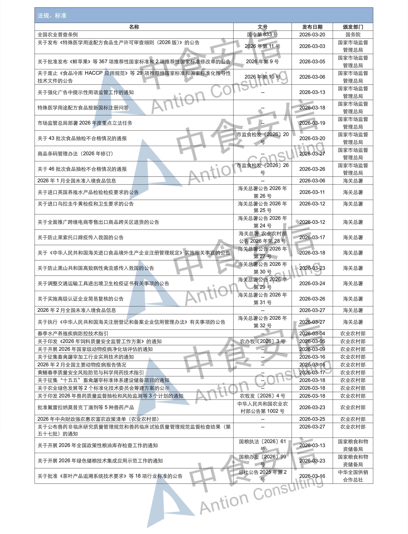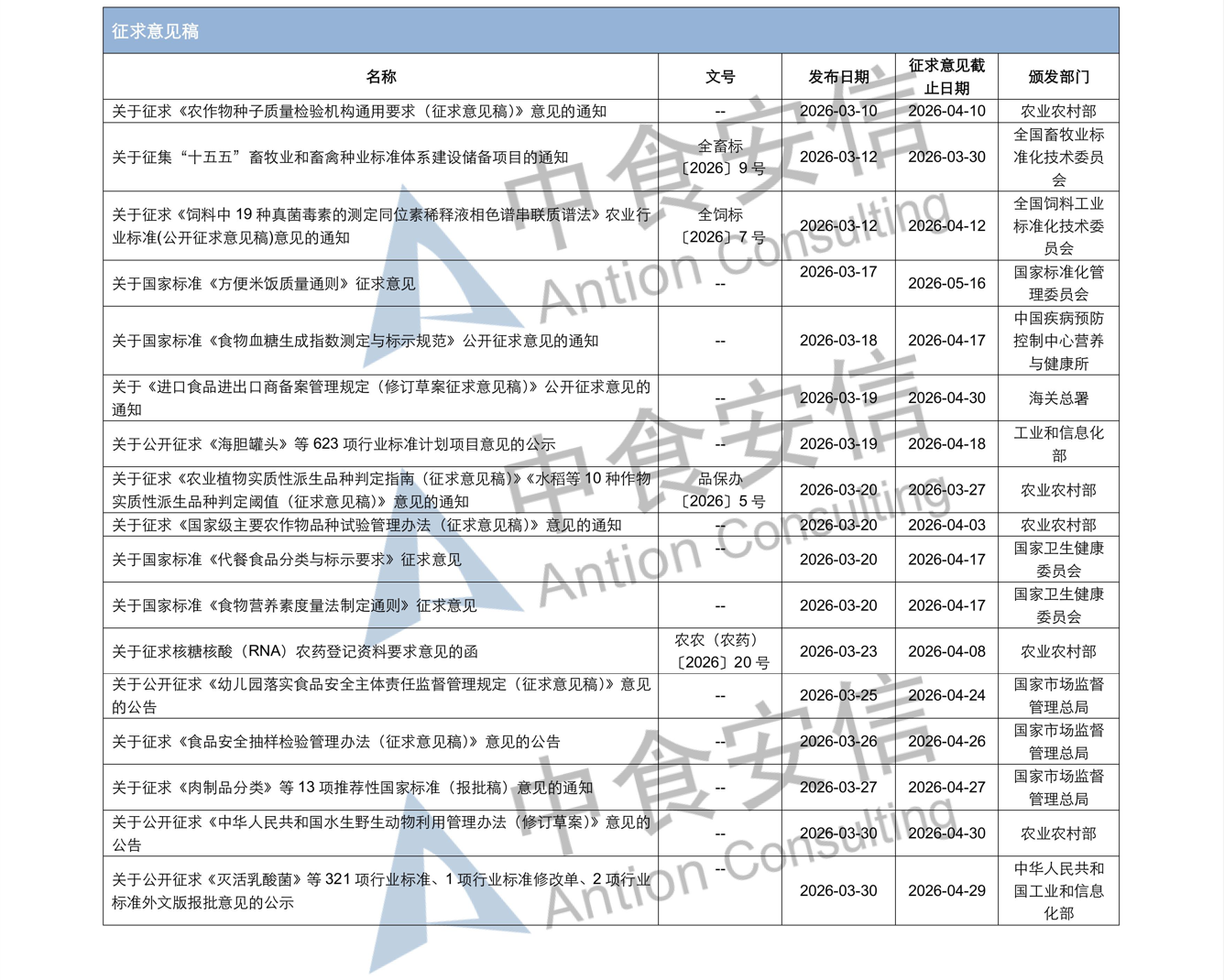 为了更好地帮助企业落地法规,中食安信对2026年3月份发布的重点法规、标准以及征求意见稿进行了简单解读,同时对本月发布的食品相关法规进行了汇总,供大家参考。
