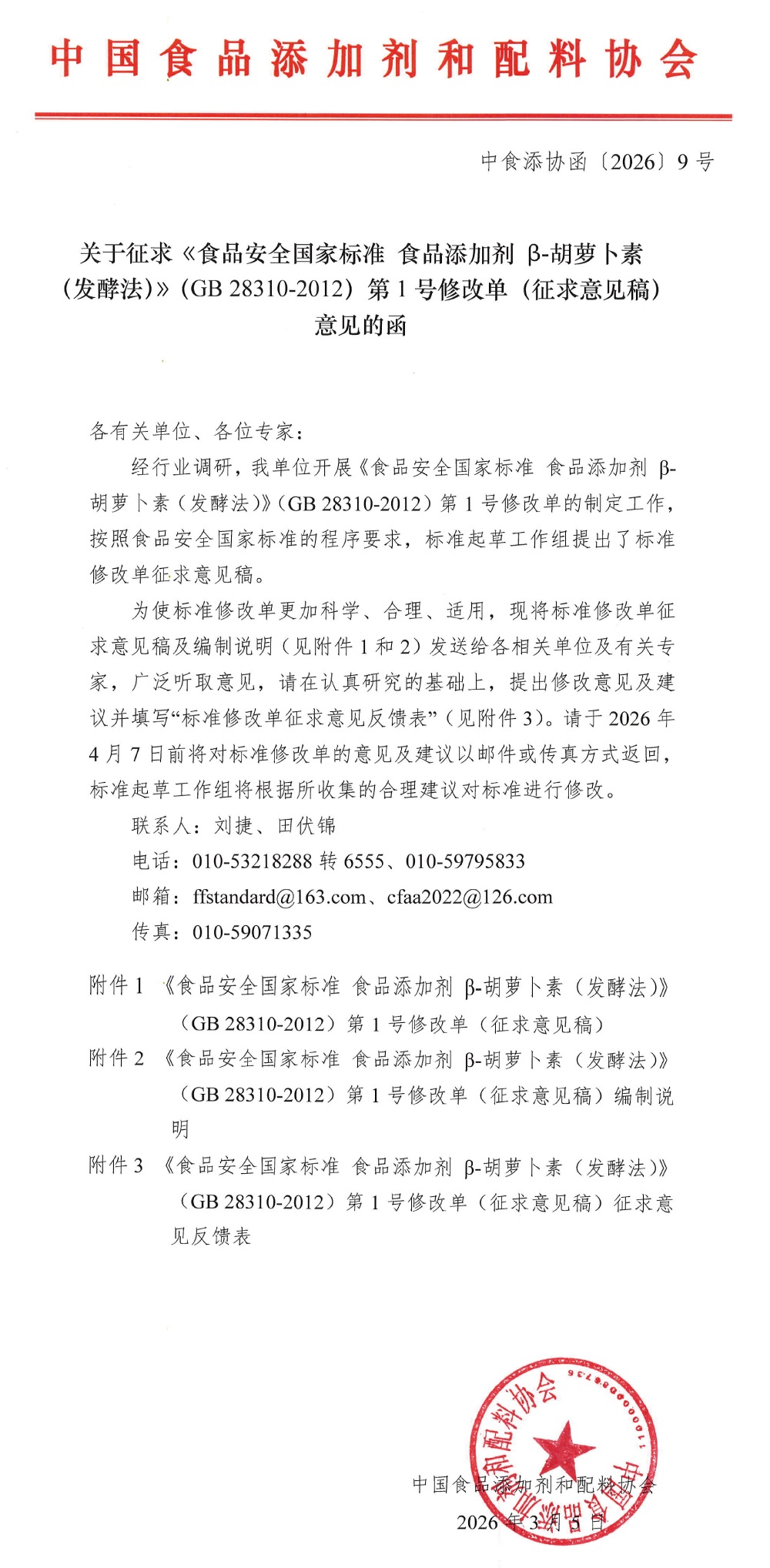 【权威】关于征求《食品安全国家标准食品添加剂β-胡萝卜素(发酵法)》(GB 28310-2012)第1号修改单(征求意见稿)意见的函