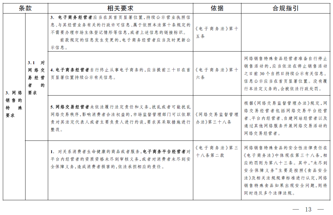 为规范网络食品交易第三方平台和入网食品经营者销售特殊食品行为,提高其合规意识,落实食品安全主体责任,保障网络销售特殊食品安全,根据《中华人民共和国食品安全法》及其实施条例、《电子商务法》、《网络食品安全违法行为查处办法》等法律法规和食品安全国家标准的规定,市场监管总局组织制定了《网络销售特殊食品安全合规指南》,现印发给你们,请结合实际认真贯彻落实。
