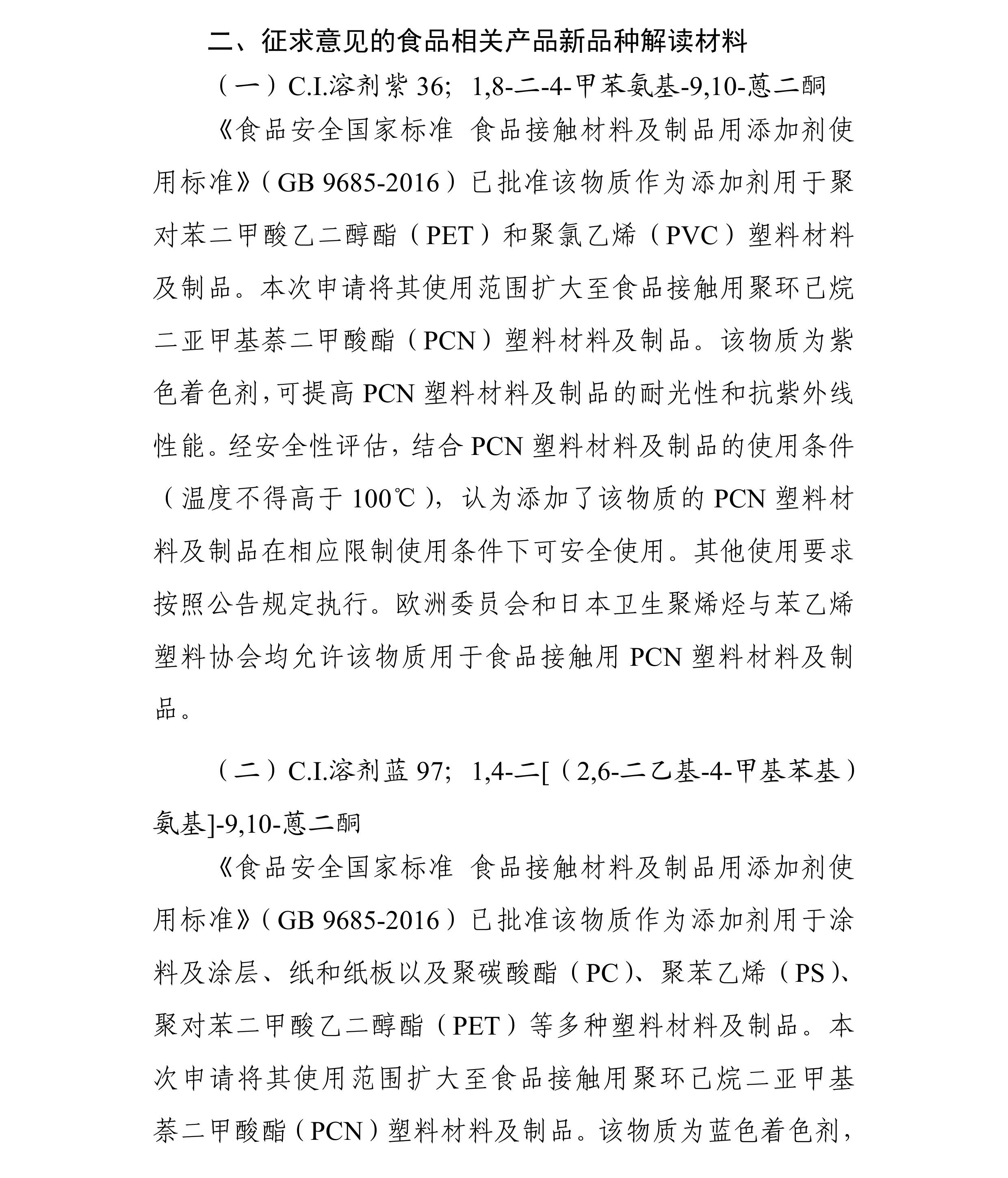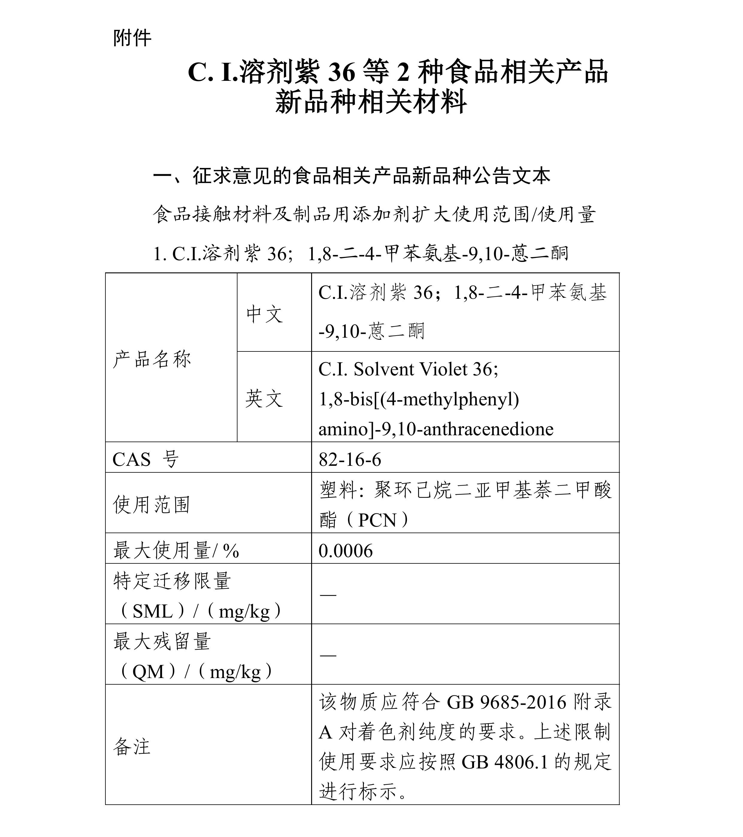 根据《食品相关产品新品种行政许可管理规定》和《食品相关产品新品种申报与受理规定》要求,C.I.溶剂紫36等2种食品相关产品新品种已通过专家评审委员会技术评审(具体情况见附件)。现公开征求意见,请于2026年3月26日前将书面意见反馈至邮箱,如在截止日期前未反馈相关意见,视为无不同意见。