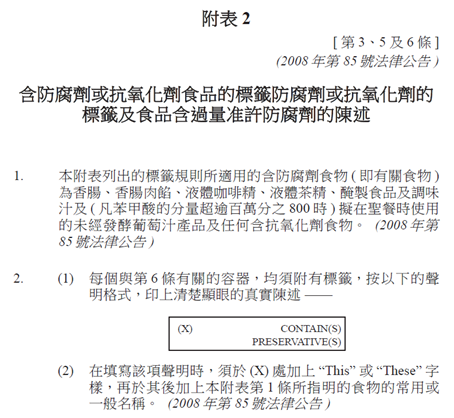 在第132BD章附表1中,分为四栏列出允许使用的类别、准许防腐剂/抗氧化剂的名称及其国际编码系统的辨别编号(INS)、在食品内的最高准许含量以及使用时的附注说明。要注意的是,在非表列的正面清单中的防腐剂/抗氧化剂不得使用。