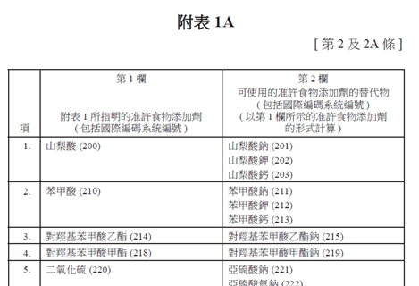 附表1A在附表1的基础上,列出了部分防腐剂/抗氧化剂的替代物,如山梨酸钠(201)、山梨酸钾(202)、山梨酸钙(203)在使用上等同于附表1中的山梨酸(200)。