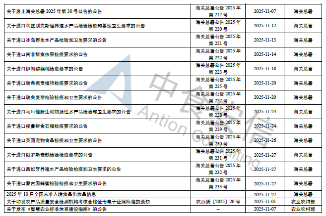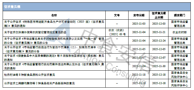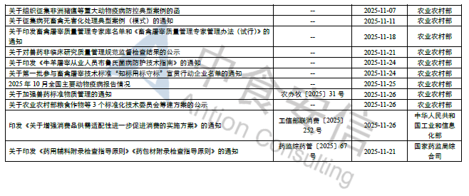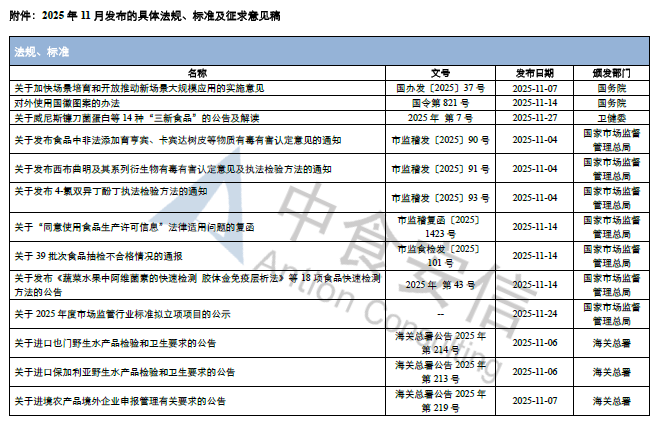 为了更好地帮助企业落地法规,中食安信对2025年11月份发布的重点法规、标准以及征求意见稿进行了简单解读,同时对本月发布的食品相关法规进行了汇总,供大家参考。