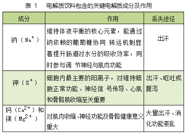 电解质饮料是一种专门设计的用于补充人体因出汗、呕吐、腹泻等情况丢失的水分和电解质的饮品,其核心价值在于同时提供水分和关键电解质,快速、有效地维持体液的渗透压平衡和正常生理功能。电解质饮料包含的关键电解质成分及作用见表1。电解质饮料能通过补充这些成分,帮助身体在水分和电解质大量丢失时,快速恢复平衡,保障神经、肌肉等系统的正常运作。