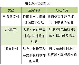 三者的适用场景对比见表2。简言之,三者的核心区别在于:电解质饮料聚焦“平衡”,运动饮料聚焦“运动表现”,能量饮料聚焦“短期兴奋”,需根据具体需求选择。