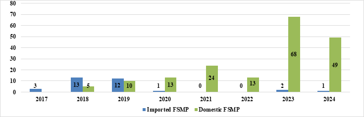 As can be seen from Figure 1,China's FSMP industry has flourished in recent years,and the number of domestically approved products has increased significantly. Initially,all approved products were imported products,but after 2019,domestically approved products continued to dominate. From 2017 to 2019,the number of registered and approved imported FSMP was significantly higher than that of registered and approved domestic FSMP;From 2019 to 2024,the number of registered and approved domestic FSMP was significantly higher than that of registered and approved imported FSMP. In 2024,50 products were approved,of which 49 are domestic FSMP and 1 is imported FSMP.